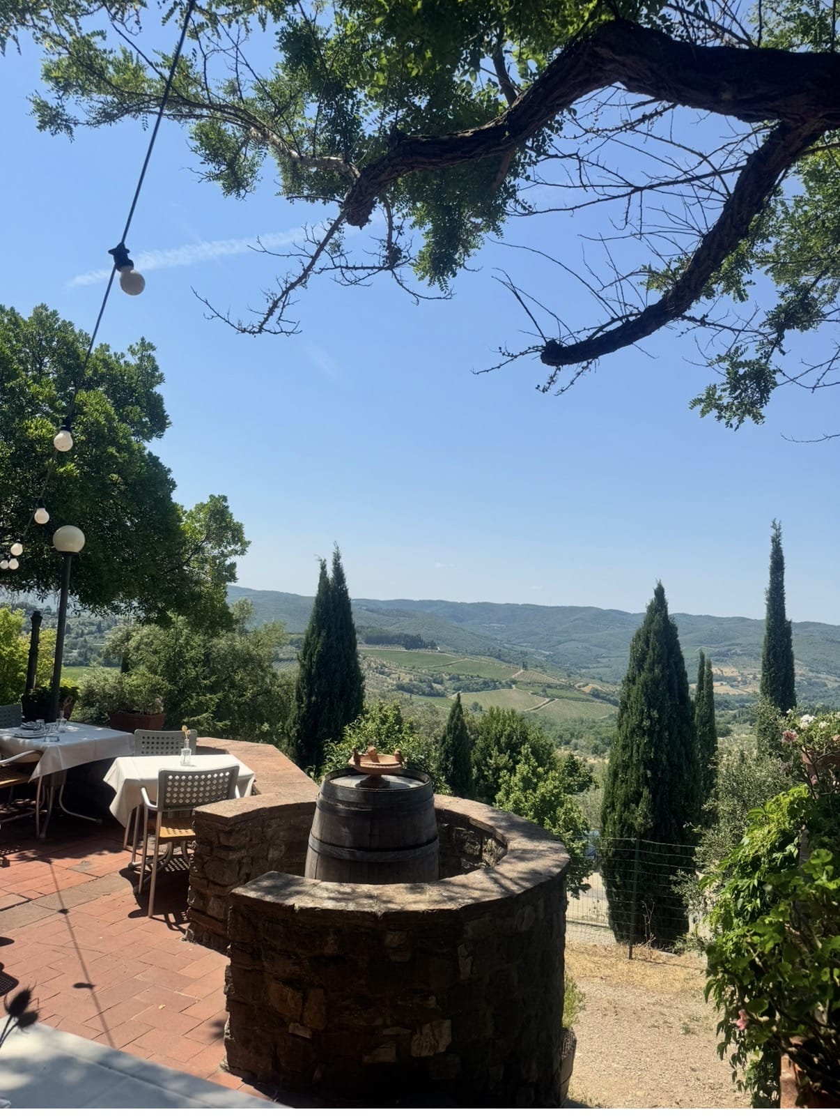 Com um terraço com vista deslumbrante das colinas e vinhedos de Chianti, criando um cenário perfeito para apreciar a culinária.
